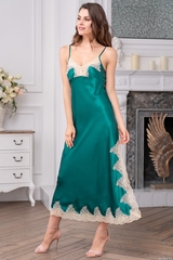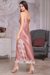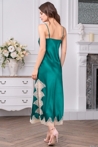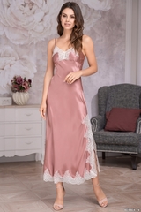Длинная сорочка Mia-Amore на тонких бретелях с подрезом под грудью из смесового шелкового полотна. Лиф и низ сорочки декорированы изысканным тонким кружевом, вырезанная по форме кружева кромка ткани придает удивительную воздушную легкость модели. Дизайн коллекции - студия Angelo Bellini (Milano).