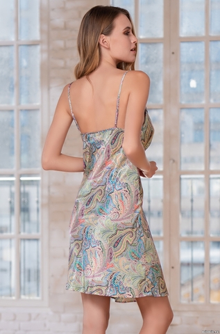 Короткая сорочка Mia-Amore с отрезным лифом на тонких бретелях выполнена из принтованного искусственного шелка. Лиф сорочки декорирован контрастным кантом и бантиком. Состав: полиэстер 100%