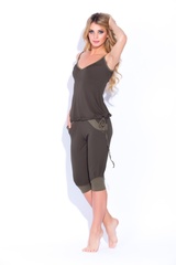 Актуальный комплект из нежной натуральной вискозы - отличный и практичный вариант на каждый день! Идеален в качестве одежды для спорта, дома или отдыха. Универсальная свободная и комфортная модель.Комплект состоит из майки с тонкими лямками, открывающими область плеч, в нижней части майки - кулиска, позволяющая легко сформировать нужный вам силуэт. Бриджи с низкой проймой в стиле "афгани" с комбинированными вставками, свободного геометрического покроя, с широким поясом, и манжетам внизу, модный, современный стиль. Комбинированная расцветка из ткани полу тонов - хит сезона! Состав: 100% вискоза
