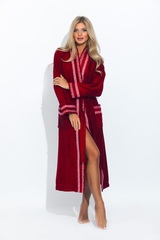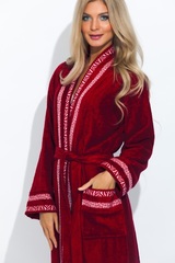 Стильный и изысканный халат из двух сторонней махровой ткани с добавлением бамбуковой нити. 100% натуральный материал - очень нежный, легкий и приятный к телу. Мягкие линии всего изделия создают ощущение легкости и лаконичности. Богатая декоративная отделка с красивым жаккардовым рисунком по передним полам халата, на манжете рукава и карманах.