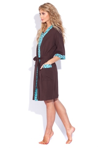 - Трикотажный халатик средней длины, на поясе, воротник в стиле кимоно(длина халата по спинке - 94см.), с цветной отделкой по манжетам и на карманах.