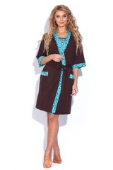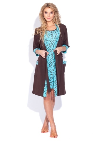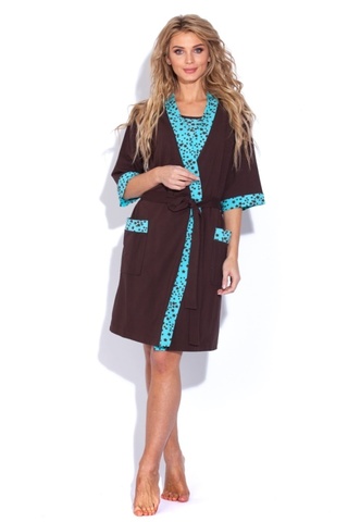Уютный домашний комплект из натурального хлопка. Красивое сочетание темно-шоколадного цвета и нежно-ментолового в мелкую звездочку. Оригинальное решение отделки карманов и рукавов в виде собранного бантика. Декоративные трикотажные "зажимчики" на лямках ночной сорочки. Множество этих приятных деталей несомненно украшают изделие и делают его привлекательным.В комплект входит: