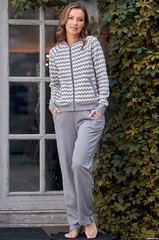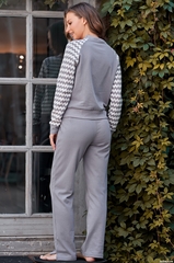 Костюм Mia-Mella состоит из жакета с длинным рукавом и брюк. Жакет выполнен из двухцветного трикотажа с отделкой из однотонного футера. Жакет с застежкой на молнию и карманами. Брюки выполнены из футера. Пояс на резинке с кулисой для дополнительной фиксации. По бокам брюк обработаны карманы, а по низу небольшие разрезы. Состав Двухцветный трикотаж (50% акрил, 30% вискоза, 20% полиэстер), однотонный футер (80% хлопок, 20% полиэстер)