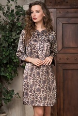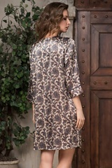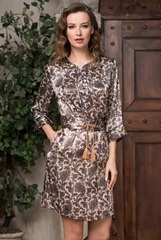 Туника Mia-Amore длиной чуть выше колен с рукавом ¾, выполнена из принтованного смесового шелка. По центру - застежка на пуговицы. Узкие контрастные канты расположены вдоль планки и по линии притачивания манжет. В боковых швах расположены карманы. По низу рукавов и низу туники расположены разрезы. В комплекте идет широкий двухсторонний пояс (однотонный/принтованный) с кистями. Состав 70% натуральный шелк, 25% полиэстер, 5% эластан
