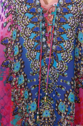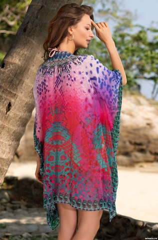 Туника Mia-Amore свободного кроя, выполнена из принтованного шифона. Горловина декорирована стразами и шнуровкой.