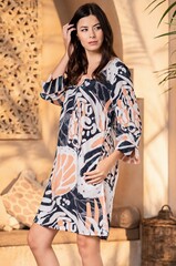 Туника свободного силуэта с рукавом длиной ¾, выполнена из тканной принтованной вискозы с отделкой в виде контрастных кантов. Длина туники чуть выше колен. По бокам обработаны карманы. По низу расположены разрезы.