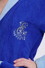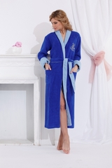 Изысканный женский халат класса Люкс из нежной махровой ткани с добавлением бамбука. Внешняя сторона под велюр, а внутренняя петельчатая махра, создающая приятный и легкий массажирующий эффект. Удлиненная модель. Халат с воротником - шалькой, рукавами с манжетам, легко регулирующимся по длине руки. Контрастная отделка воротника, манжета рукава и 2-х стороннего пояса. Красивая и нежная вышивка на левой полочке в виде нежных цветов и листочков.