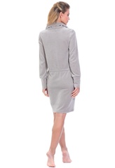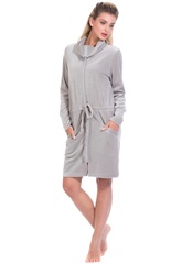 Оригинальный халат на молнии из благородного велюра серебристо-серого цвета с приятным полу-матовым отблеском. Свободная модель абсолютно не сковывает движений, а кулиска по талии позволяет создать прямой или слегка приталенный силуэт. Оптимальная и комфортная длина чуть выше колена(рост модели на фото - 172 см.). Воротник в модном исполнении в виде "хомута" при полном закрытии молнии, которую можно раскрыть и создать свободный отложной ворот. Полноценный рукав с манжетам в нижней части. Внутренние карманы. Нежный велюр очень приятен к телу и имеет благородный матовый отблеск.Такая модель халата идеально сидит на любой фигуре. В нем приятно не только окунуться в мир домашнего уюта, но и с удовольствием встретить гостей. А также это оптимальный и комфортный вариант в любую поездку.И вы всегда будете выглядеть привлекательной и желанной! Состав: велюр: 80% хлопок, 20% пэ