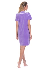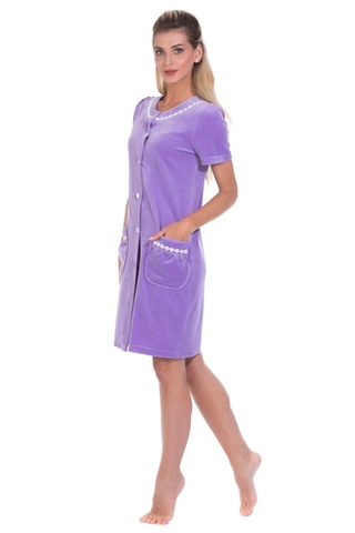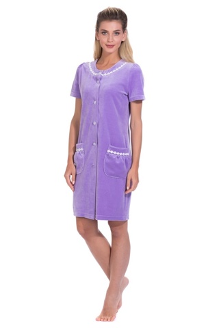 Легкий и комфортный халат на пуговицах из нежного велюра. Изделие прямого силуэта, абсолютно не сковывает движений и позволяет ощутить комфорт и полную свободу! Универсальная длина чуть выше колена(рост модели на фото - 172 см.). Удобные и стильные пуговицы с серебристыми вкраплениями великолепно сочетаются с элементами отделки халата и позволят легко выбрать желаемую высоту запаха. О - образный свободный ворот. Рукав 1/2. Оригинальные накладные карманы. Нежное кружево в виде цветов кремового цвета украшает зону ворота и верхнюю планку на карманах, а так же красиво сочетается с пуговицами. Велюр - мягкий и очень приятный к телу, имеет благородный матовый отблеск.