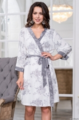 Запашной халат Mia-Mella на поясе с рукавом ⅞. Низ рукавов и полы декорированы мережкой и кантом из ткани-компаньона. В комплекте два пояса — светлый и темный. Состав 100% вискоза