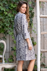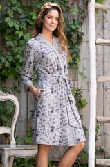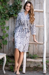 Запашной халат Mia-Mella средней длины с рукавом 3/4. Выполнен из принтованного меланжа, а отделка из серого. В боковых швах расположены карманы. Состав 35% акрил, 35% полиэстер, 25% вискоза, 5% спандекс