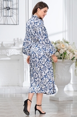 Длинный халат Mia-Amore выполнен из принтованного искусственного шелка. Рукава халата, карманы и борт декорированы контрастным кантом. Халат запахивается с помощью пояса.