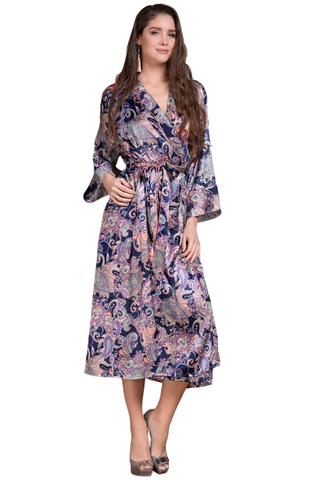 Длинный классичеcкий халат–кимоно Mia-Amore с длинным рукавом, выполнен из принтованного смесового шелка с отделкой в виде контрастного канта по краю борта и низу рукавов. По бокам обработаны карманы.