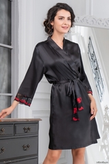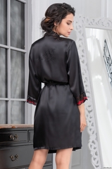 Короткий халат Mia-Amore выполнен из черного искусственного шелка в сочетании с красным кружевом. Низ рукавов украшен кружевом, на спинке халата – эффектная аппликация из черных страз с логотипом бренда. Состав: полиэстер 100%