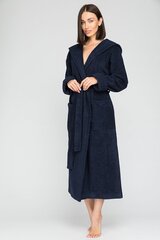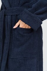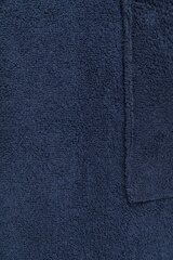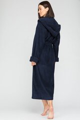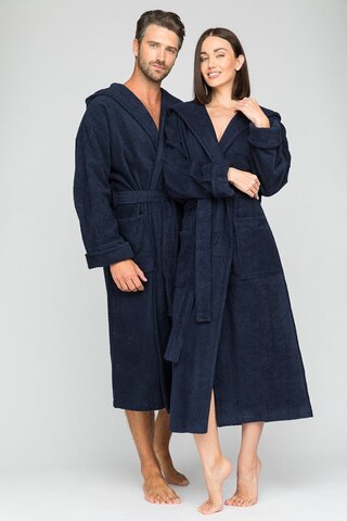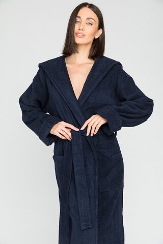 Двухсторонняя махра создает ощущение мягкости, комфорта и легкого массажирующего эффекта. Глубокий синий цвет, полноценный двухсторонний капюшон, который легко накинуть на голову и просушить волосы. Свободные широкие рукава с манжетами с возможностью подворота по длине руки. Полноценная длина ниже середины икры.